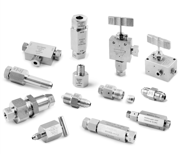中高压管阀件:接口尺寸范围为1/8"至1",工作压力从10,000psig至60,000psig,温度范围为-252℃至649℃,主体材料为高强度316不锈钢