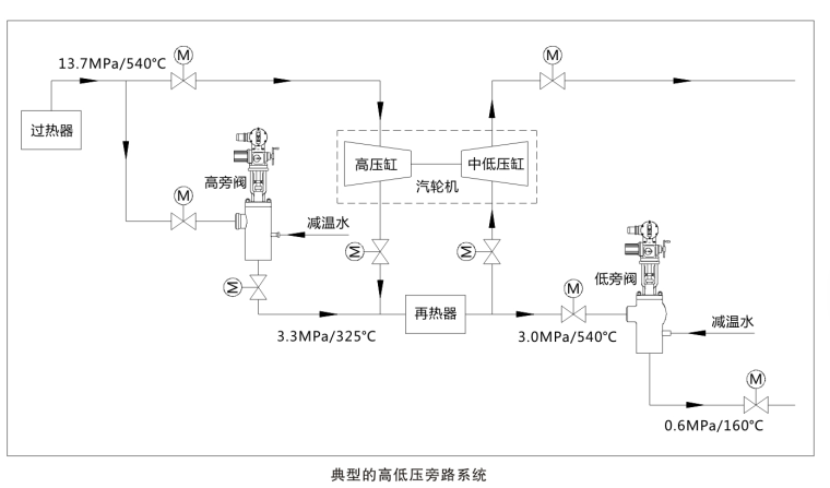 42 汽机旁路系统专用控制阀 汽轮机旁路系统专用控制阀有高压旁路阀和低压旁路阀,其主要作用有:(1)保护再热器,(2)改善启动条件,加快启动速度,(3)回收工质,消除噪声。